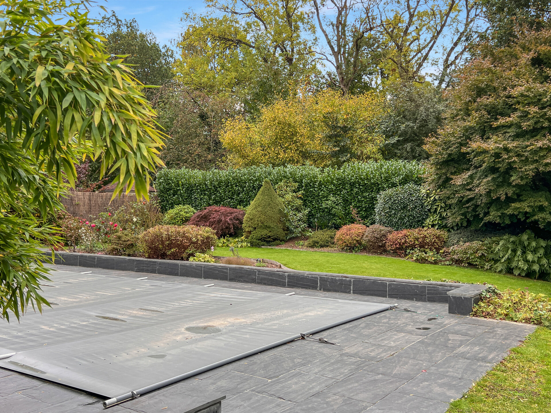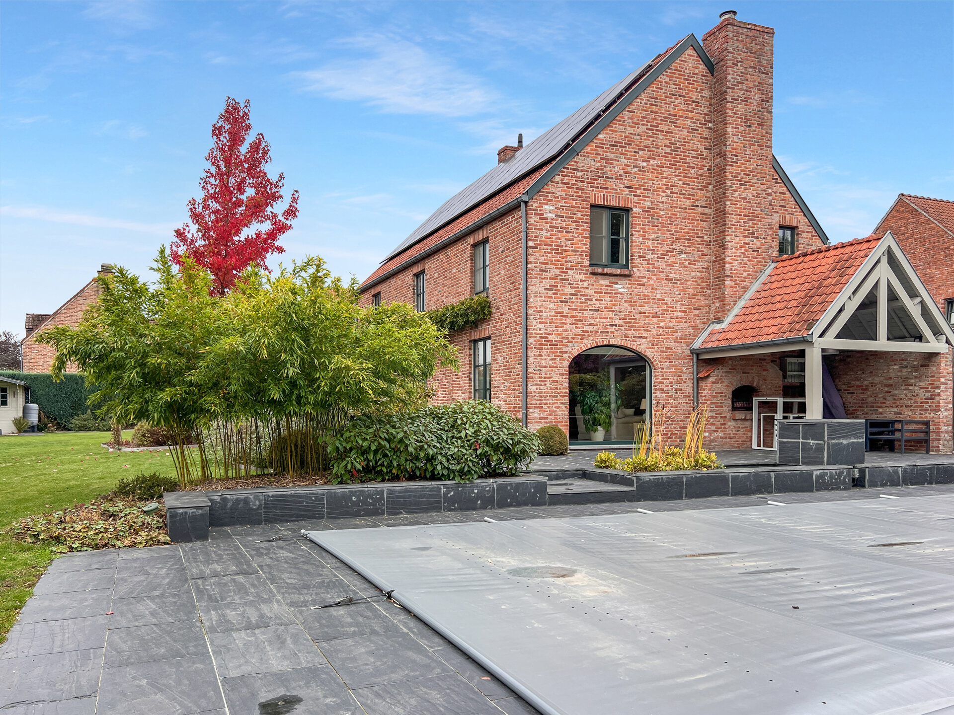 Les terrasses s’étirent vers un écrin paysager, savamment dessiné, où se mêlent coins ombragés, senteurs florales et le murmure apaisant d’une piscine chauffée.