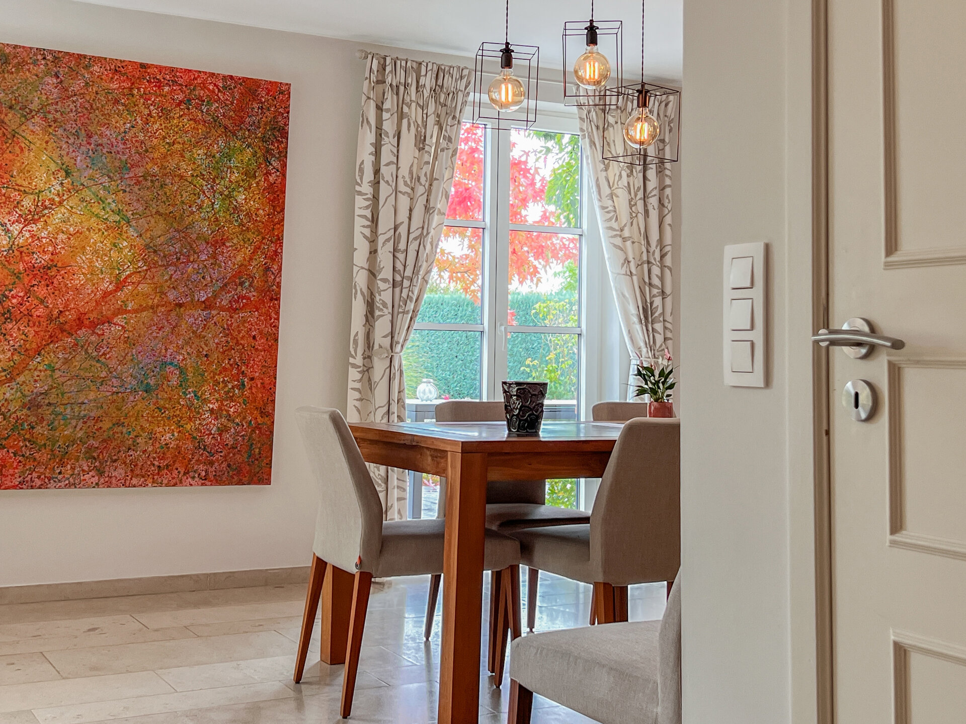 À l’intérieur, tout respire la quiétude et la clarté : de larges ouvertures invitent le soleil à entrer, soulignant la chaleur d’un espace de vie ouvert sur le jardin.